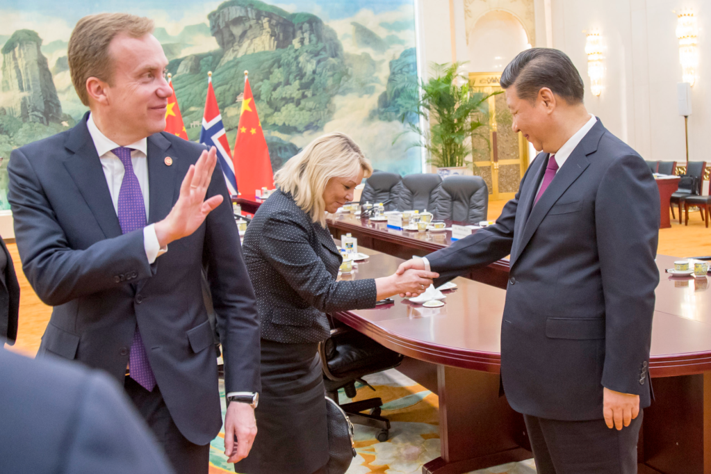 Næringsminister Monica Mæland neier for Kinas president Xi Jinping i nærvær av utenriksminister Børge Brende i Folkets store hall i Beijing den 10. april 2017 i forbindelse med et offisielt norsk besøk der gjenopptagelse av det politiske og økonomiske samarbeidet var hovedformålet. Foto: Heiko Junge / NTB.
